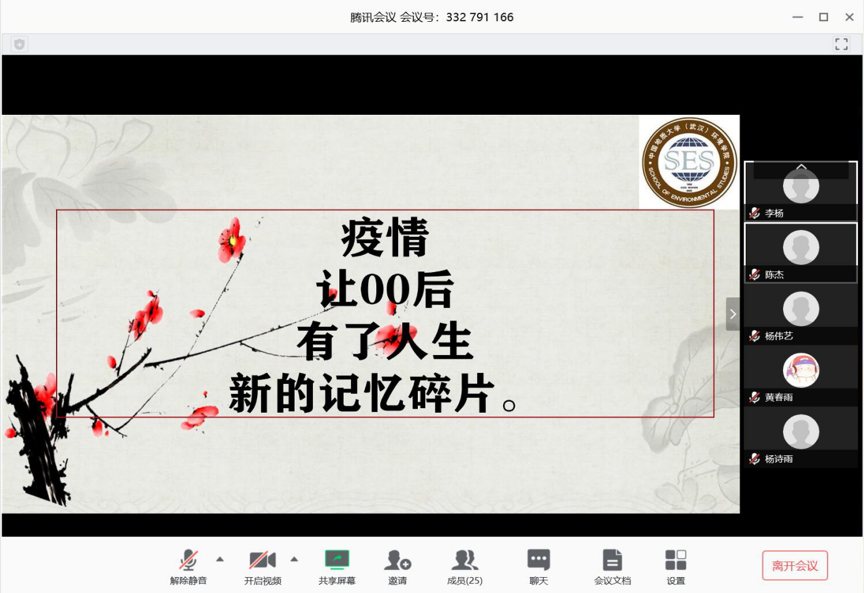 播放疫情下武汉宣传视频,邀请几名同学分享疫情对家乡的影响与居家生活。来自武汉的王頔、南昌的刘健、山东的裴宝来和贵州的黄春雨同学分别与大家分享了隔离期间居住地的疫情情况与政策,以及他们在生活、学习方面的状况。
