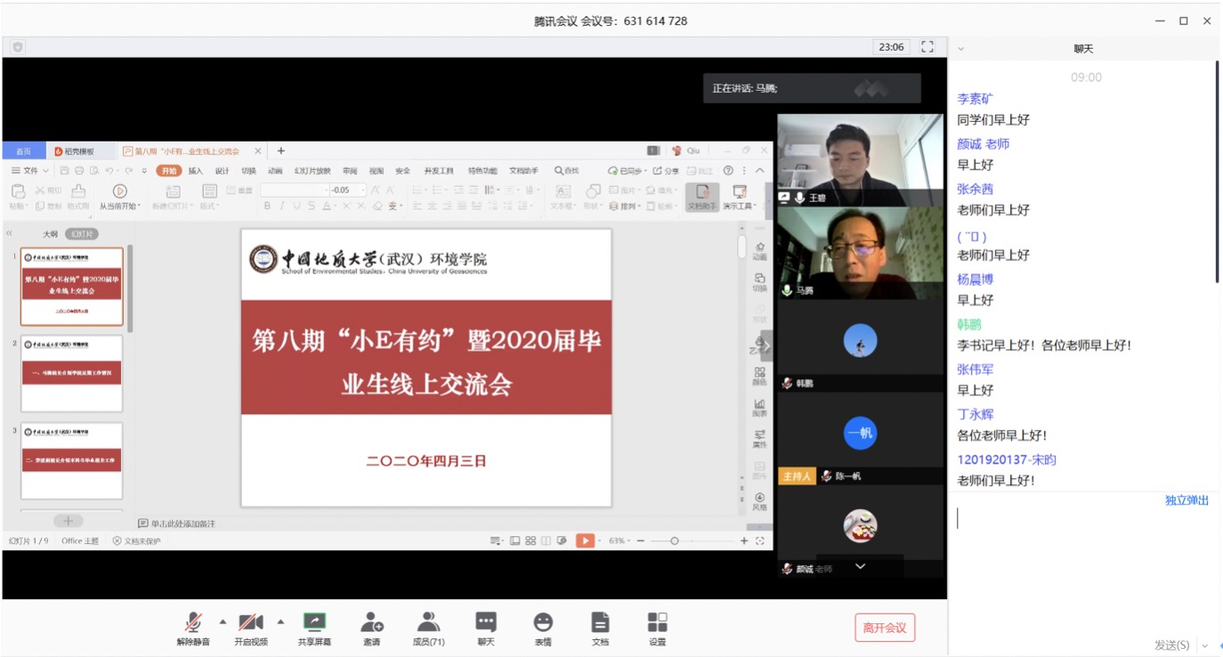 (通讯员王碧 编辑耿婧)为深入贯彻习近平总书记关于“顺利毕业,尽早就业”的重要指示精神,落实学校关于加强2020届毕业生就业工作相关要求,切实解决毕业生在毕业、就业方面遇到的问题、困难,我院于4月3日上午举行第八期“小E有约”暨2020届毕业生线上交流会。学院党委书记李素矿,院长马腾,副院长柴波、谢先军,党委副书记姜明敏、本科毕业班班主任、本研教学秘书、毕业年级辅导员及80余名本研毕业生代表参加交流会。