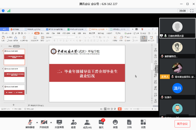 毕业年级辅导员王碧介绍相关专业毕业生就业情况。他说,当前就业形势严峻,就业推进工作时间紧、压力大,就业工作推进须全员参与,从唤醒意识、转变思想、汇聚资源、拓展渠道、精准帮扶等方面下功夫,指导帮助毕业生充分就业、高质量就业。