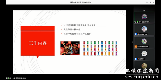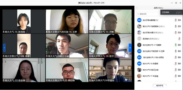 活动第三项,双方支部同学分享抗疫事迹。在抗击疫情的斗争中,不管是南京大学的学子还是本就身处武汉的地大学子,都积极响应国家号召,投身抗疫斗争中。会上,南京大学的本科生朱琳箫、研究生王昱分别向我们分享了在家乡抗击疫情的事迹和感受,中国地质大学(武汉)的博士生刘姗和本科生王倩也分别分享了在武汉抗疫的经历。他们纷纷表示愿意尽自己的绵薄之力来和国家渡过难关,共抗疫情。希望疫情早日散去,祝愿祖国繁荣昌盛。