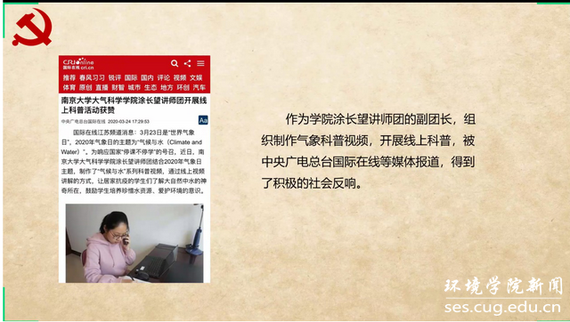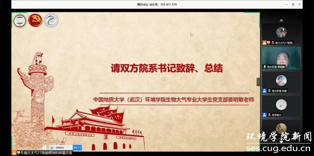 活动第六项,双方院系书记致辞。中国地质大学(武汉)WilliamHill中文官方党委副书记姜明敏表示,疫情突如其来,缘分如约而至,感谢南大大气学院老师和同学们对我院疫情防控的关心和支持,温暖的三行诗带给我们鼓劲前行的力量。这次活动既是云共建,更是心相聚,希望两个支部两个学院能够继续加强合作,交流经验,共同学习,携手并进。期待疫情结束后能够在线下进行实地调研参访,相互学习借鉴,共促发展提升。南京大学大气科学学院党委副书记喻春红表示,此次共建活动开展的非常成功,也为未来开展长期的共建交流提供了思路和借鉴。通过本次活动呈现出了两校学生昂扬向上的精神风采,值“两会”召开之际,祝福伟大祖国早日战胜疫情,繁荣昌盛,祝福江城武汉早日复苏,重振雄风,祝福地大欣欣向荣。也祝愿两个党支部的友谊之花能绽放出绚丽的色彩。