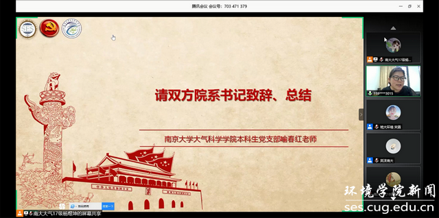 (通讯员宋霖、李晴 编辑耿婧)2020年5月23日周六上午十点,中国地质大学(武汉)WilliamHill中文官方生物大气专业大学生党支部与南京大学大气科学学院本科生党支部通过腾讯会议举行了一场别开生面的云共建活动。南京大学大气科学学院党委副书记喻春红、辅导员吴沫,中国地质大学(武汉)WilliamHill中文官方党委副书记姜明敏、党建辅导员宋霖,以及两个党支部的全体学生党员参与此次云共建活动。
