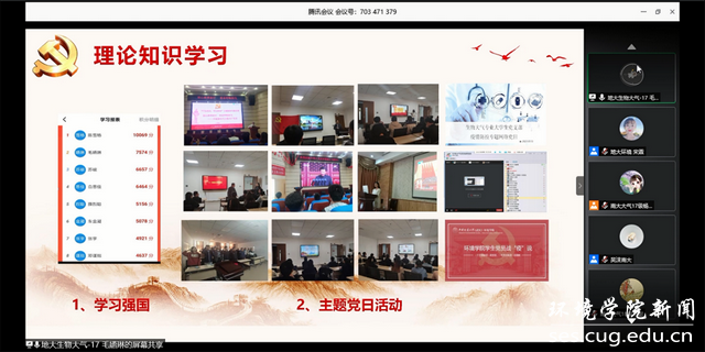 活动第一项,双方支部党员介绍校史及院系情况。南京大学孟一霖同学、杨文宇同学分别介绍了校史、院史及院系情况。南京大学坐落于钟灵毓秀、虎踞龙蟠的金陵古都,是一所历史悠久、声誉卓著,师资力量雄厚的百年名校。南京大学大气科学学院建立于1944年,前身是南京大学大气科学系,是中国最早建立的气象学系,是中国现代气象科学的摇篮。WilliamHill中文官方通过播放院长马腾录制的院系情况视频进行介绍。WilliamHill中文官方是全国党建工作标杆院系、教育部首批“三全育人”综合改革试点学院和湖北省试点改革学院。学院以建设地球科学与环境领域国内外知名的跨学科研究型学院为目标,以地质环境保护为特色,以多学科交叉为优势,以破解区域性社会发展与生态保护矛盾问题为使命,探究人与自然的和谐共生方案。