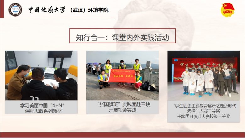 “张国旗班”团支部将以环境文化论坛、专业资源平台和支部第二课堂为载体,引领青年专业精湛,加强新技能培训学习。支部成员积极参与科技论文报告会以及“科研助成长”系列活动,获科报会院级三等奖,第六届“互联网+”大学生创新创业大赛三等奖,“兖州中材杯”武汉理工大学第十三届环保创意作品大赛二等奖、三等奖等。