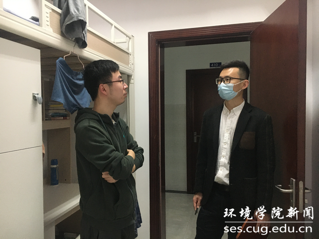 王海锋一行先后走访本科生、研究生宿舍,与学生亲切交谈,了解同学们学生生活情况,对学生进行安全知识宣传与教育,提高防范意识,警惕电信诈骗,提醒同学们注意用水用电安全,严禁使用违章电器。同时仔细检查宿舍卫生状况,叮嘱同学们保持良好生活习惯,维护好宿舍卫生环境。临近五一劳动节假期,王海锋提醒同学们注意五一假期出行安全,严格执行请销假制度,外出做好疫情防护。