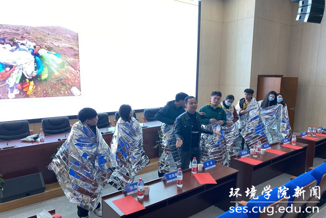 江汉大学曹志凯老师以《户外安全》为题,讲解失温、溺水、地质灾害等安全问题的预防与脱险策略。培训中的互动环节将现场气氛推向高潮。