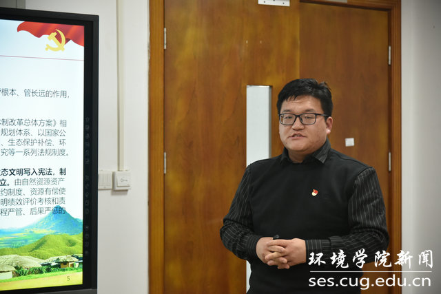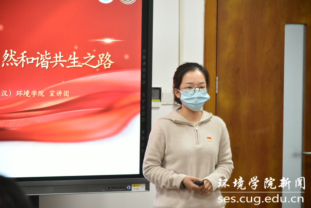 学生党支部书记共学党的二十大精神。“美丽中国讲师团”学生代表、2020级博士研究生党支部书记姜磊玉,环境工程专业大学生党支部支委陈鹏飞分别代表所在支部分享学习党的二十大精神心得体会。姜磊玉以“守护地下水,探索人与自然和谐共生之路”为主题进行分享。她通过回顾党的二十大报告中提到的新时代十年伟大变革,强调生态环保中“地下水”的重要性。结合自身专业,她介绍了水文地质学的发展,并依据当今地下水遇到的问题,解读目前我国的治水之策。通过分享6条用水之道,勉励大家要知水善用,做“品德高尚、基础厚实、专业精深、知行合一”的地质人。随后,陈鹏飞从十年来我国生态文明建设取得的历史性成就,介绍党的二十大提出的生态文明建设重大部署,向大家分享所在支部党小组自主研学的主要内容形式。