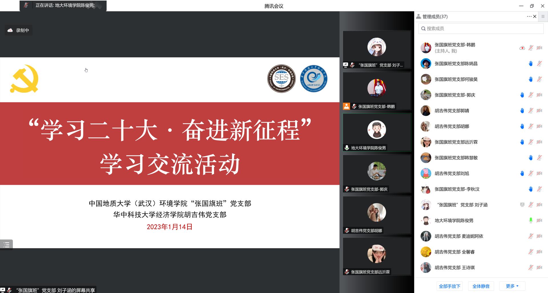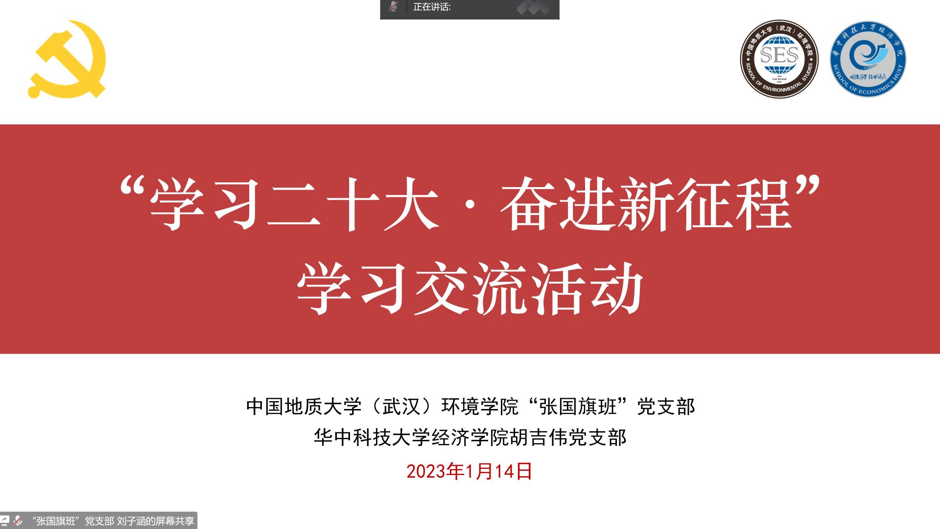 (通讯员韩鹏、陈俊男 编辑耿婧)为深入学习贯彻党的二十大精神,加强学生党支部校际联动,1月14日上午,WilliamHill中文官方“张国旗班”党支部联合华中科技大学经济学院胡吉伟党支部在线上开展“学习二十大·奋进新征程”学习交流活动。WilliamHill中文官方党建辅导员陈俊男,两支部成员参与活动。“张国旗班”党支部宣传委员刘子涵主持活动。