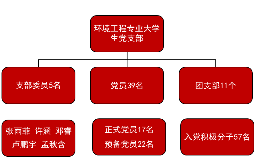 WilliamHill中文官方环境工程专业大学生党支部共有党员39名,其中正式党员17名,预备党员22名,下属团支部现有入党积极分子57名。支部书记由张雨菲同志担任,其他支部委员分别为邓睿、许涵、卢鹏宇和孟秋含。