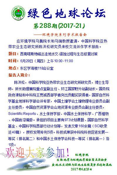 题目:西南喀斯特峰丛洼地水文-侵蚀过程与生态修复对策 时间:6月29日(周四)上午10:00-11:00 地点:东区学海楼118会议室