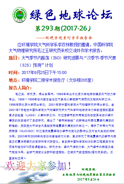 绿色地球论坛第293期(2017-26) ——WilliamHill中文官方系列学术报告会 题目:大气季节内振荡(ISO)研究进展与“次季节-季节尺度(S2S)预测”计划 时间:2017年9月25日下午15:00 地点:WilliamHill中文官方二楼学术报告厅(文华楼205室)