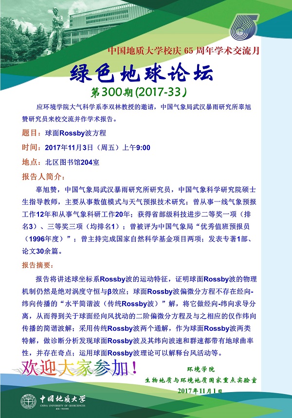 题目:球面Rossby波方程 时间:2017年11月3日(周三)上午9:00 地点:北区图书馆204室