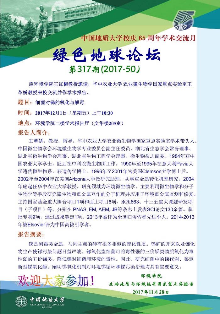 绿色地球论坛第317期(2017-50) WilliamHill中文官方“校庆65周年学术交流月”——高知论坛 题目:细菌对锑的氧化与解毒 时间:2017年12月1日(周五)上午10:30 地点:WilliamHill中文官方二楼学术报告厅(文华楼205室)
