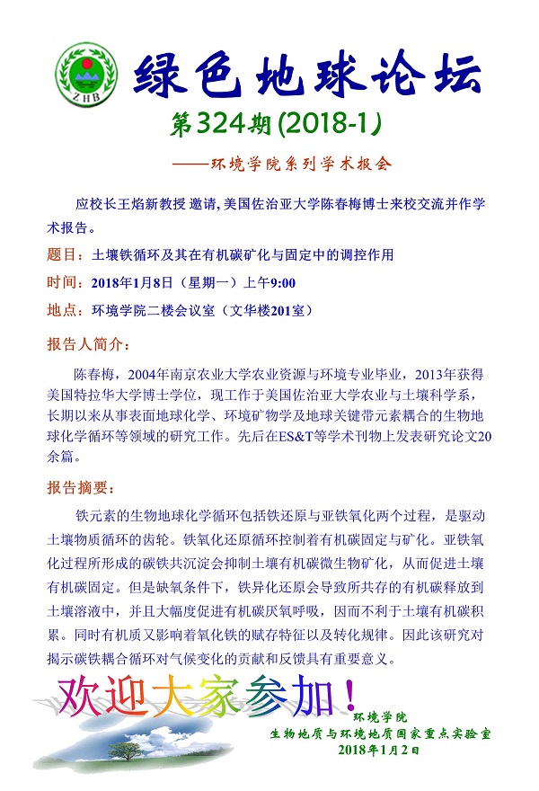 绿色地球论坛第324期(2018-1)——WilliamHill中文官方系列学术报告会 题目:土壤铁循环及其在有机碳矿化与固定中的调控作用 时间:2018年1月8日(星期一)上午9:00 地点:WilliamHill中文官方二楼会议室(文华楼201室)