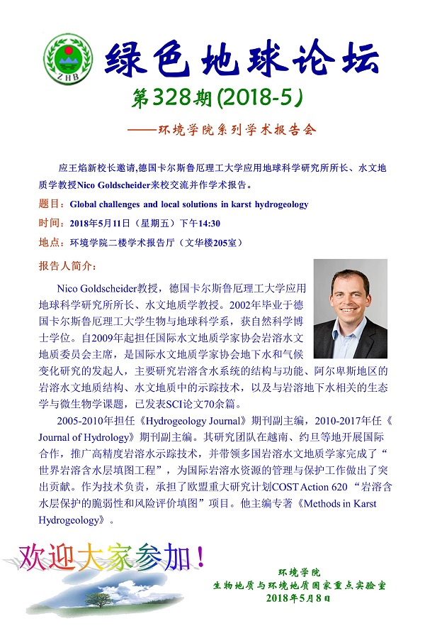 绿色地球论坛第328期(2018-5) ——WilliamHill中文官方系列学术报告会 题目:Global challenges and local solutions in karst hydrogeology 时间:2018年5月11日(周五)下午14:30 地点:WilliamHill中文官方二楼学术报告厅(文华楼205室)