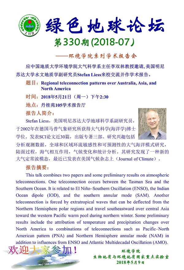 绿色地球论坛第330期(2018-7) ——WilliamHill中文官方系列学术报告会 题目:Regional teleconnection patterns over Australia,Asia, and North America 时间:2018年5月21日(周一)下午14:30 地点:丹桂苑105学术报告厅
