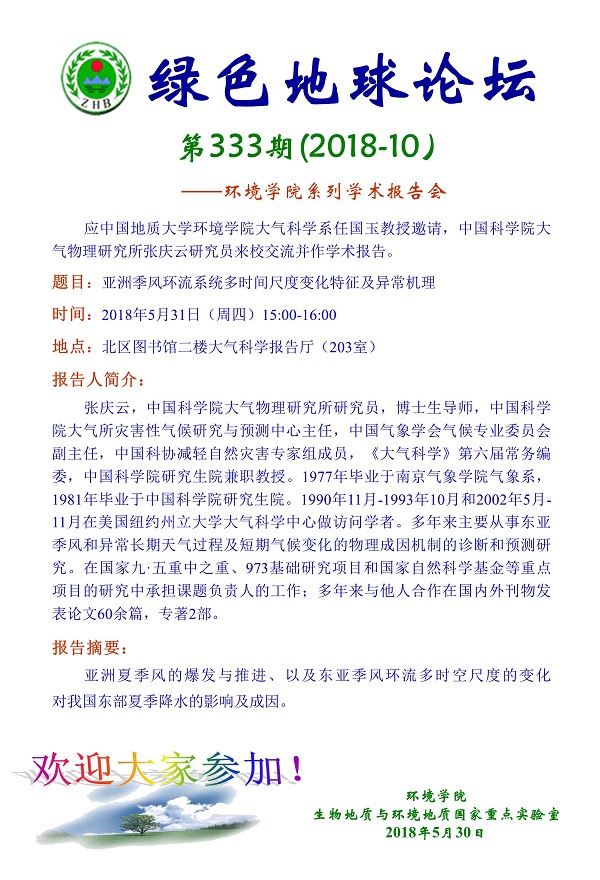 绿色地球论坛第333期(2018-10) ——WilliamHill中文官方系列学术报告会 题目:亚洲季风环流系统多时间尺度变化特征及异常机理 时间:2018年5月31日(周四)15:00-16:00 地点:北区图书馆二楼大气科学报告厅(203室)