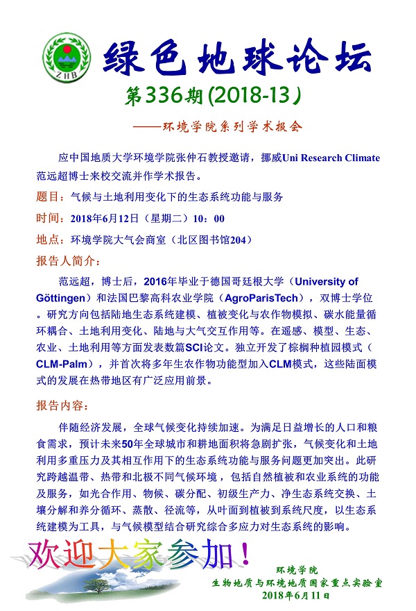 绿色地球论坛第336期(2018-13) ——WilliamHill中文官方系列学术报告会 题目:气候与土地利用变化下的生态系统功能与服务 时间:2018年6月12日上午10:00 地点:WilliamHill中文官方大气会商室(北区图书馆204)
