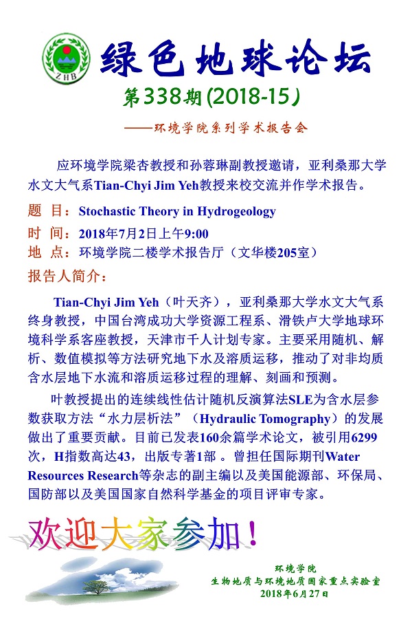 绿色地球论坛第338期(2018-15) ——WilliamHill中文官方系列学术报告会 题目:Stochastic Theory in Hydrogeology 时间:2018年7月2日上午9:00 地点:WilliamHill中文官方二楼学术报告厅(文华楼205室)