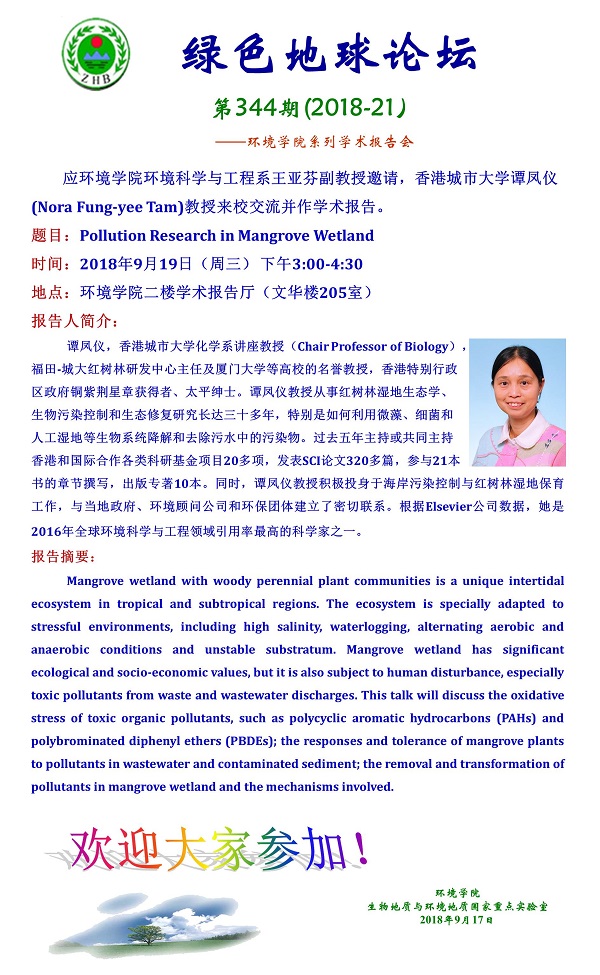 绿色地球论坛第344期(2018-21) ——WilliamHill中文官方系列学术报告会 题目:Pollution Research in Mangrove Wetland 时间:2018年9月19日(周三)下午3:00-4:30 地点:WilliamHill中文官方二楼学术报告厅(文华楼205室)