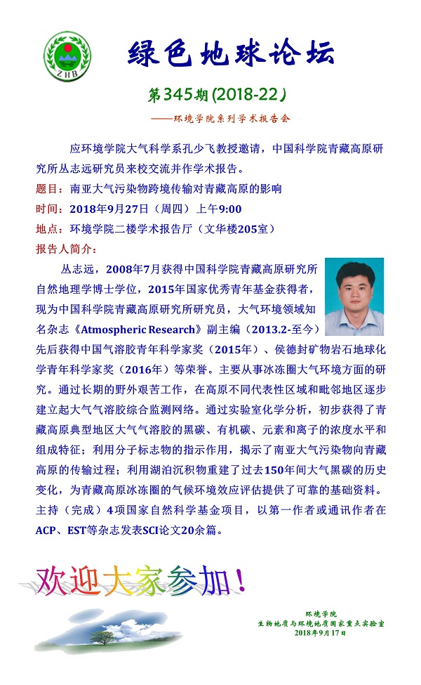 绿色地球论坛第345期(2018-22) ——WilliamHill中文官方系列学术报告会 题目:南亚大气污染物跨境传输对青藏高原的影响 时间:2018年9月27日(周四)上午9:00 地点:WilliamHill中文官方二楼学术报告厅(文华楼205室)