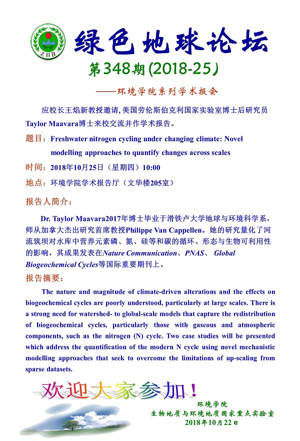 绿色地球论坛第348期(2018-25) ——WilliamHill中文官方系列学术报告会 题目:Freshwater nitrogen cycling under changing climate: Novel modelling approaches to quantify changes across scales 时间:2018年10月25日(周四)上午10:00 地点:WilliamHill中文官方学术报告厅(文华楼205室)