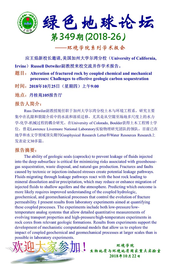 绿色地球论坛第349期(2018-26) ——WilliamHill中文官方系列学术报告会 题目:Alteration of fractured rock by coupled chemical and mechanical processes: Challenges to effective geologic carbon sequestration 时间:2018年10月25日(周四)上午9:00 地点:丹桂苑105报告厅