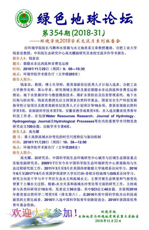 绿色地球论坛第354期(2018-31) ——WilliamHill中文官方2018学术交流月系列报告会 题目: 裂隙水非达西流和非费克运移——钱家忠 黄土高原流域水沙变化的时空尺度特征与驱动机制——高光耀 时间:2018年11月29日(周四)9:00—12:00 地点:WilliamHill中文官方学术报告厅(文华楼205室)