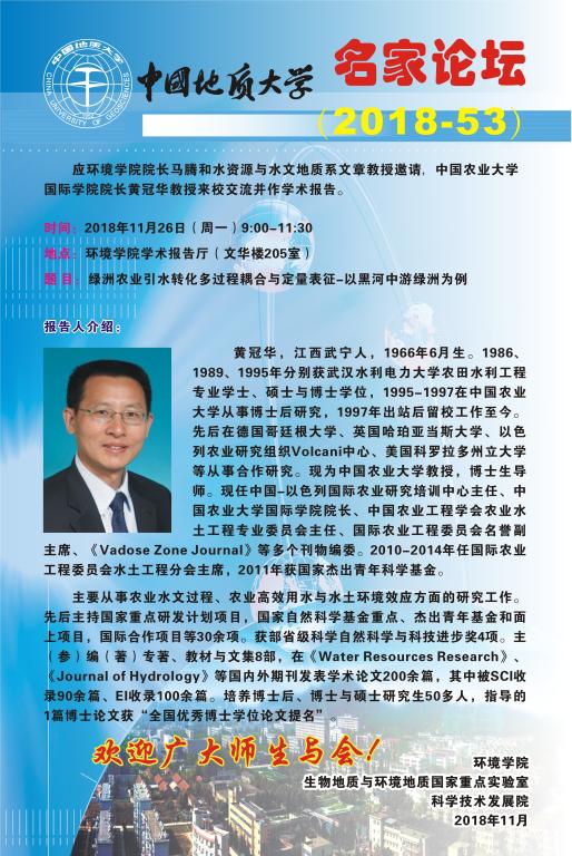 名家论坛(2018-53) 题目:绿洲农业引水转化多过程耦合与定量表征-以黑河中游绿洲为例 时间:2018年11月26日(周一)9:00—11:30 地点:WilliamHill中文官方学术报告厅(文华楼205室)