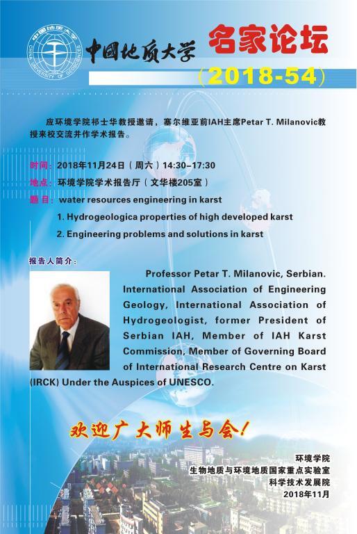 名家论坛(2018-54) 题目:water resources engineering in karst—— 1. Hydrogeologica properties of high developed karst 2. Engineering problems and solutions in karst 时间:2018年11月24日(周六)14:30 地点:WilliamHill中文官方学术报告厅(文华楼205室)