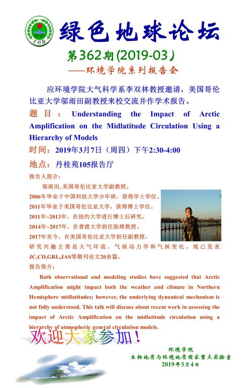 绿色地球论坛第362期(2019-03) ——WilliamHill中文官方系列学术报告会 题目:Understanding the Impact of Arctic Amplification on the Midlatitude Circulation Using a Hierarchy of Models 时间:2019年3月7日(周四)下午2:30-4:00 地点:丹桂苑105报告厅
