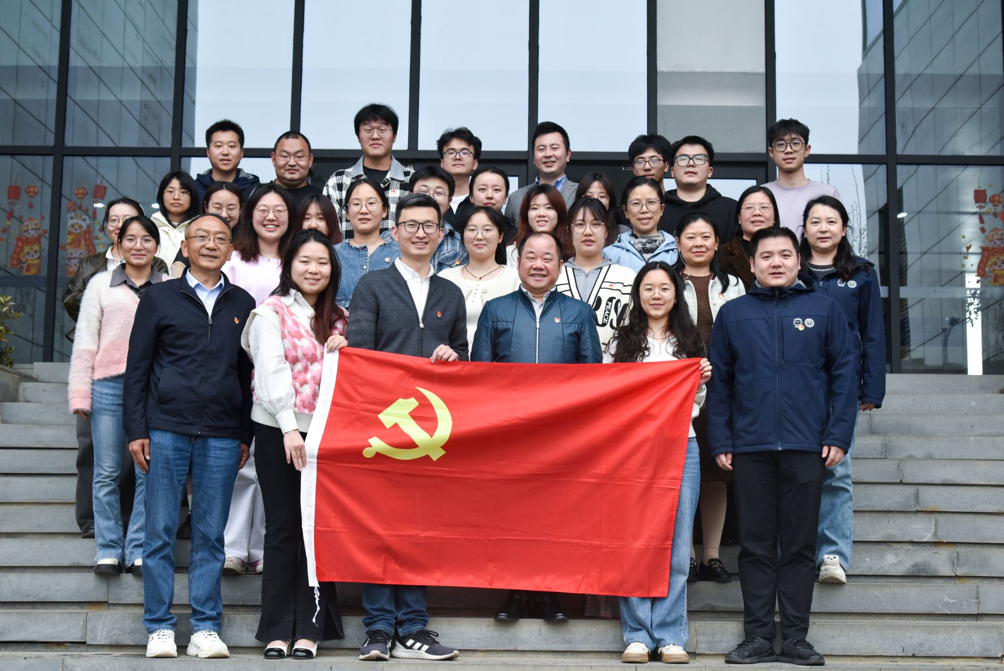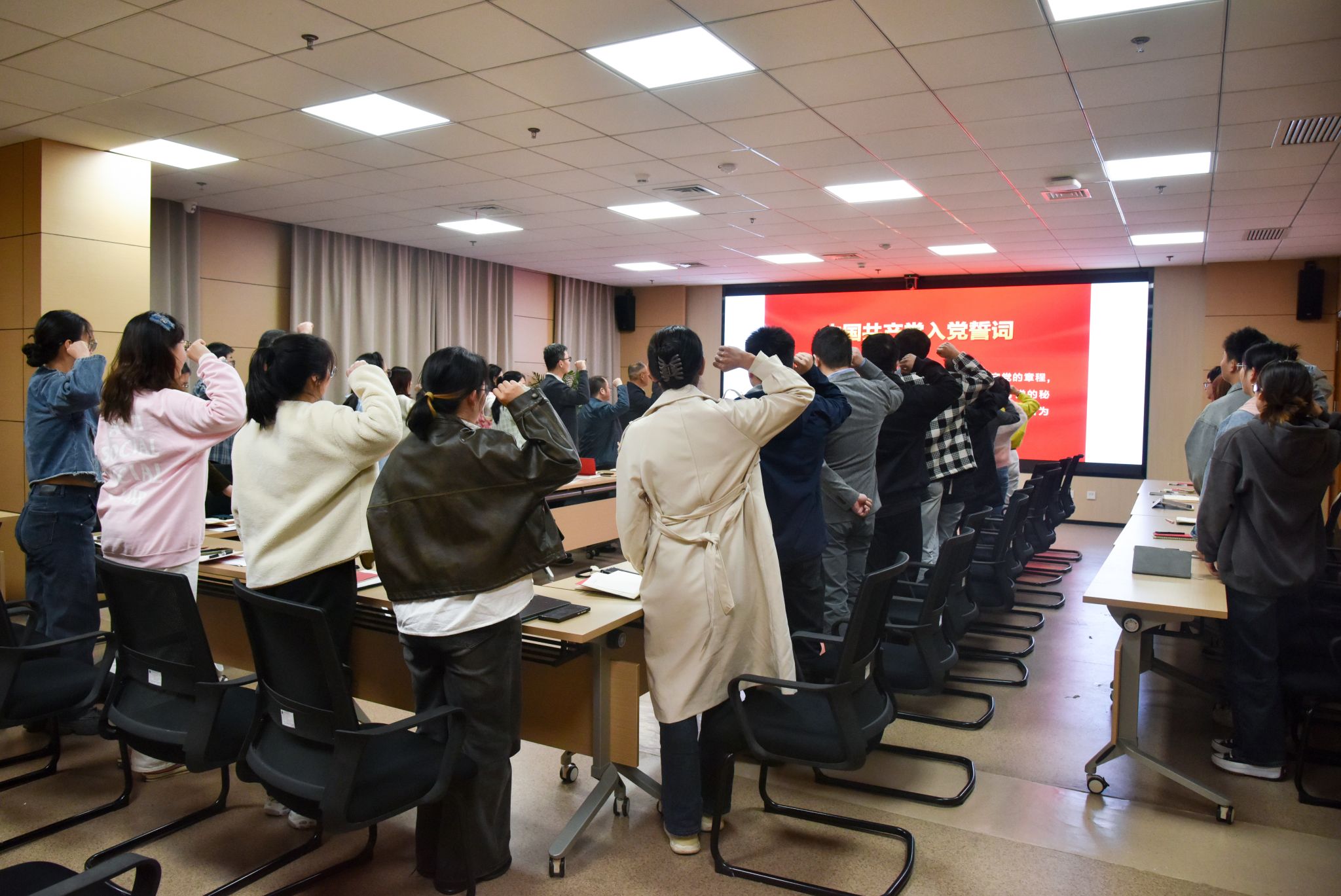 全体党员唱国歌、重温入党誓词。环境水文地质研究生第一党支部党员马晨晰领誓。