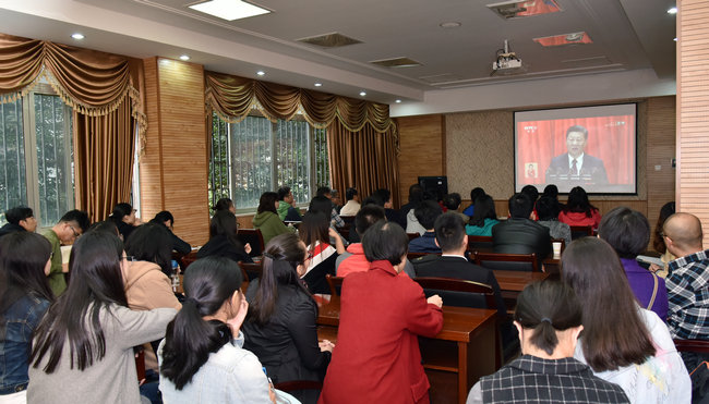 WilliamHill中文官方党委组织学院党委委员、党支部书记和师生党员在文华楼205报告厅和一层大厅集中收看收听习近平代表第十八届中央委员会向大会作的题为《决胜全面建成小康社会 夺取新时代中国特色社会主义伟大胜利》的报告。100多名师生党员参加了收看收听十九大开幕会。