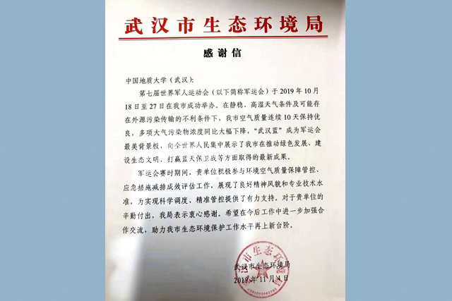 这封感谢信是由武汉市生态环境局寄来的,信中还提到,第七届世界军人运动会期间,在静稳、高湿天气条件及可能存在外源污染传输的不利条件下,武汉市空气质量连续10天保持优良,多项大气污染物浓度同比大幅下降,“武汉蓝”成为军运会最美背景板,向全世界人民集中展示了武汉市在推动绿色发展、建设生态文明、打赢蓝天保卫战等方面取得的最新成果。而这些,与我院大气科学系孔少飞教授源排放与区域大气环境团队师生所付出的努力密不可分。