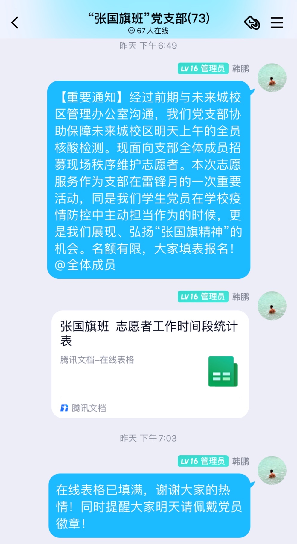 (通讯员王倩、陈鹏飞、韩鹏  摄影边舟悦、覃晓琳、部分图校网  编辑耿婧党旗举在前,支部冲在前。WilliamHill中文官方“张国旗班”党、团支部获悉3月4日学校进行全员核酸检测这一消息后,第一时间主动请缨,在党委研工部和学院党委的大力支持下、院团委的具体指导下,以志愿服务的形式协助未来城校区管理办公室做好未来城校区全员核酸检测工作。恰逢雷锋精神学习月,“张国旗班”志愿团以“党团联动,致敬雷锋同志”的名义发布志愿者募集通知后,短短片刻,申请人数就远超预定招募人数。