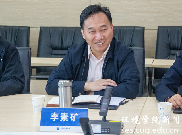 李素矿讲话,他指出两院是一家人,本次座谈是促进两院交流的一个良好的开端,未来要从党建思政、双一流建设、科研信息与资源、人才培养、学术交流等方面加强联系、互通信息、达成共识,实现两家资源共建、共享、共用,发挥地大优势,打造引领性的人才培养新范式。